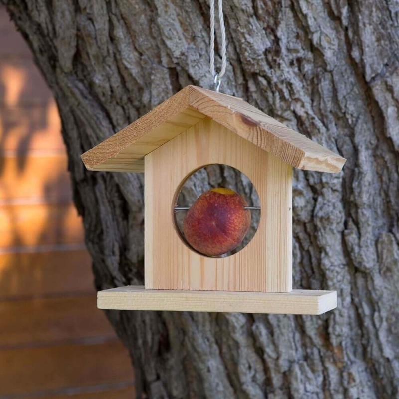 Mangiatoia in legno che assicura cibo e riparo agli uccelli selvatici.