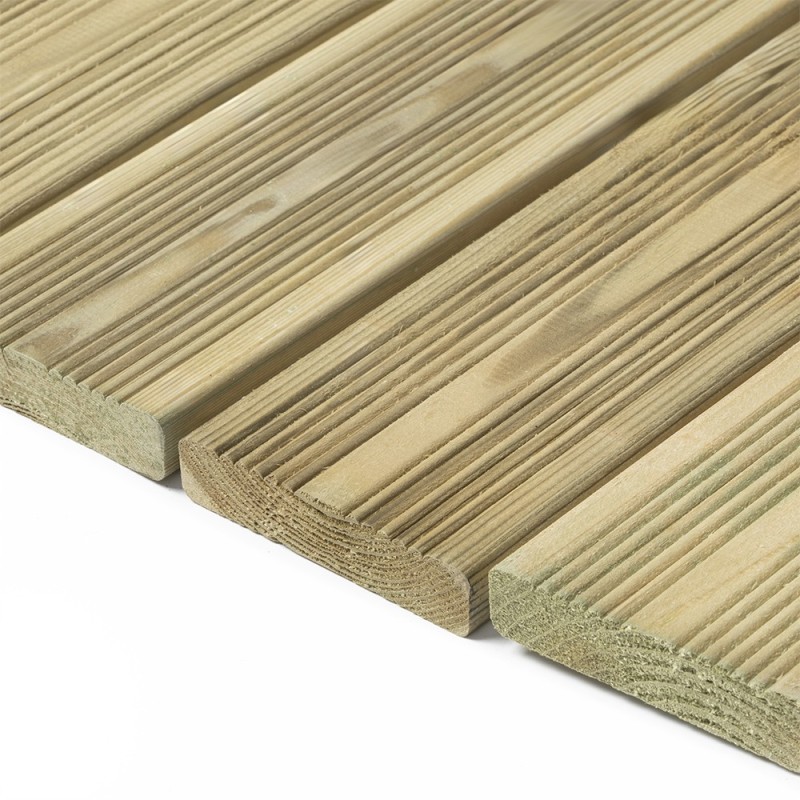 Pack of 110 outdoor wooden decking boards in planed solid pine, pressure-treated Class 3 and featuring a grooved anti-slip surface. Designed for reliable, functional exterior timber decking, suitable for residential and professional settings exposed to weather.