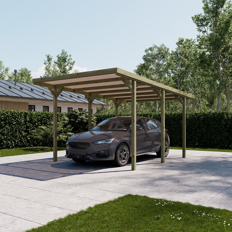 Compact, sturdy Wooden Carport 3 x 5 m, Height 2/2.34 m made from selected Nordic pine, designed to protect your car from rain, sun, and harsh weather. Reinforced structure, pressure-treated timber (Class 3), and quick installation thanks to the pre-cut kit.