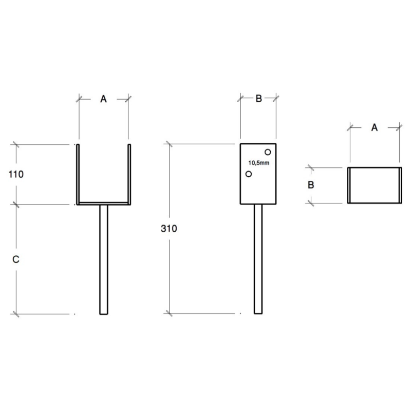 The length of the rod to be cemented is 20 cm (C). The width of the bracket is 65 mm (B). It is made of galvanized iron, which protects it from rust and corrosion. The screw-on pole bracket is part of a series of elements necessary for joining, supporting and anchoring wooden products to the ground. It is made of galvanized iron, which protects it from rust and corrosion.
