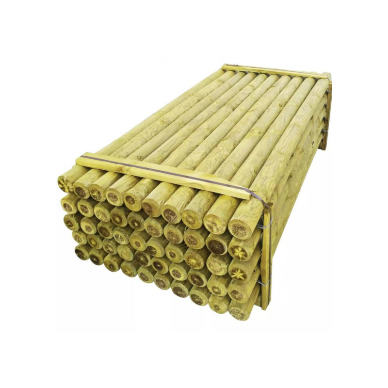 Confezione da 48 pali tondi in legno di pino Ø 8 cm, lunghezza 250 cm, senza punta. Pali torniti per una superficie liscia e uniforme e impregnati in autoclave Classe 3, ideali per staccionate, recinzioni e palizzate da esterno con installazione tramite staffe o sistemi di fissaggio dedicati.